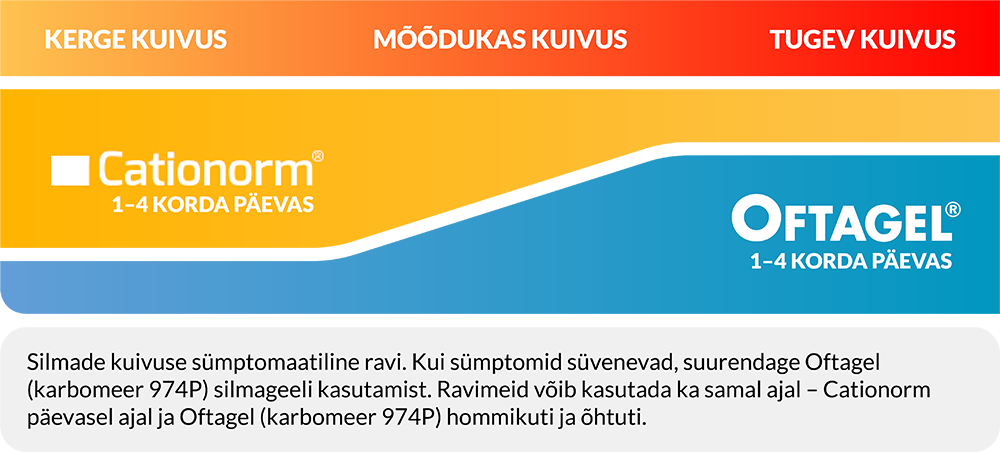 Cationorm silmatilgad sobivad kergemate ja mõõdukate sümptomite korral. Kui sümptomid süvenevad, tuleb kasutada Oftagel (karbomeer 974P) silmageeli. Neid preparaate võib kasutada ka samal ajal – Cationorm silmatilku päeval ja Oftagel (karbomeer 974P) silmageeli hommikuti ja õhtuti.